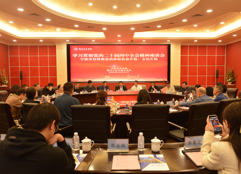 10月31日,宁波市社科联会员单位社会片组、文化片组学习贯彻党的二十届四中全会精神座谈会在我校举行。宁波市社科联(院)副主席、副院长、党组成员陈建祥作专题领学,宁波市社科联副主席、浙江万里学院党委书记王伟忠主持座谈会。来自两大片组各会员单位的负责人齐聚甬城,共赴这场思想盛宴。