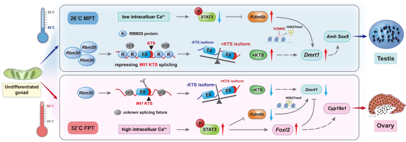 针对上述问题,研究团队以温度依赖型性别决定(Temperature-dependent sex determination, TSD)动物红耳龟(26℃产生全雄子代,32℃产生全雌子代)为研究对象,发现了RNA剪接因子RBM20在整个性别决定时期的产雄温度(Male-producing temperature, MPT)性腺中高表达;在MPT下,敲低Rbm20会导致雄性向雌性性逆转,而在FPT(Female-producing temperature, 产雌温度)下,过表达Rbm20则会诱导雄性发育;RBM20蛋白能够直接与Wt1转录本结合,调控Wt1两种剪接亚型(+KTS和−KTS)的相对表达丰度——敲低Rbm20,会导致+KTS降低、−KTS增加,而过表达Rbm20,+KTS/−KTS比例升高;Wt1 +KTS对于红耳龟雄性发育的启动是必需且充分的。基于以上发现,提出了RBM20调控红耳龟TSD的工作模型:在MPT下,RBM20高表达,抑制Wt1 KTS剪接,使+KTS转录本被更多的保留,最终启动雄性发育。相反,在FPT下,RBM20低表达,使得其他剪接因子能够识别并剪切KTS,+KTS水平降低,最终促进卵巢分化。该研究为RNA选择性剪接在脊椎动物性别决定中的调控作用提供了首个直接遗传证据,有助于我们更深入地理解动物性别决定过程中的剪接调控机制及其演化意义。