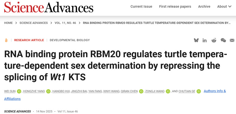 11月14日,我校葛楚天教授团队在Science Advances期刊上发表题为“RNA-binding protein RBM20 regulates turtle temperature-dependent sex determination by repressing the splicing of Wt1 KTS”的研究论文,揭示了一个RNA结合蛋白RBM20调控红耳龟性别决定的分子机制。浙江万里学院为第一单位,孙伟和杨洪哲为论文共同第一作者,葛楚天、王宗吉为共同通讯作者。该是学校继2018年、2020年两次刊登Science正刊后在动物性别决定领域的第三篇重要研究成果。