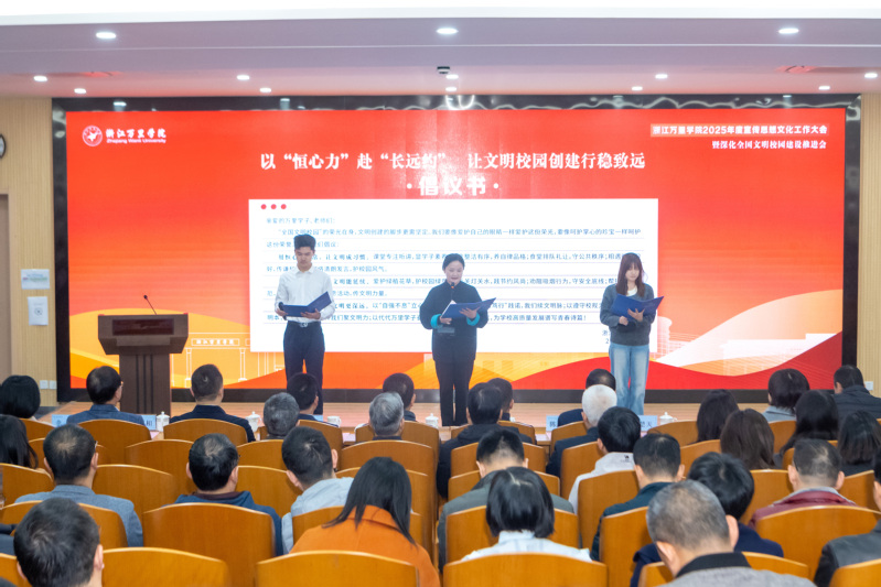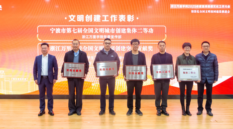 党委书记王伟忠从制定背景、核心内容和落实要求等方面对《中共浙江万里学院委员会关于加强和改进新时期宣传思想文化工作的实施方案》《浙江万里学院深化全国文明校园建设实施方案》《浙江万里学院关于新时期深化推进生活思政的实施意见》进行了全方位解读并作工作部署。他表示,本次大会是学校转型发展、升大申博关键时期召开的重要会议,是落实党的二十届四中全会“社会文明程度明显提升”、省委十五届八次全会“人的文明素养和社会文明程度全面提升”的要求,也是全面贯彻学校第三次党代会“1566”总体部署。“全国文明校园”的牌子分量千钧,承载着万里人十年磨一剑的不懈追求与深厚积淀,彰显了学校一任接着一任干、一张蓝图绘到底的坚定信念。