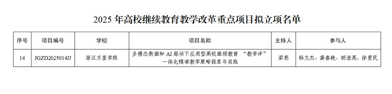 近日,浙江省教育厅办公室正式公布了2025年高等职业教育和高校继续教育教学改革项目立项名单,由我校继续教育学院申报的“多模态数据和AI驱动下应用型高校继续教育“教学评”一体化精准教学策略探索与实践”省级教学改革重点项目成功获批。