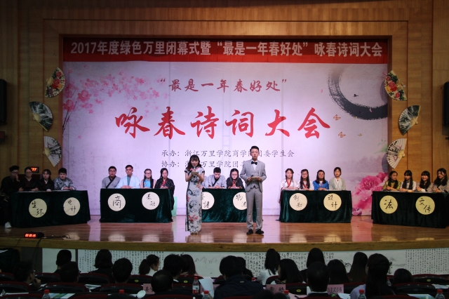 4月14日下午,由商学院承办的我校2017年度“绿色万里”系列活动闭幕式暨“最是一年春好处,万里书香飘甬都”诗词大会在学术报告厅举行。校党委副书记王伟忠、姜羡萍,校秘书长、党委宣传部部长王福银以及绿色万里组委会的老师们莅临现场观摩诗词盛会。