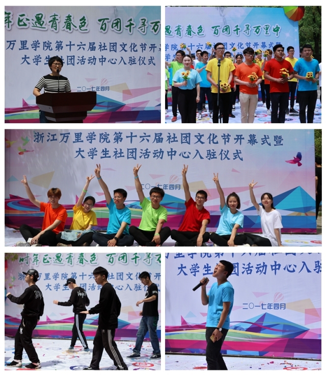4月18日中午,生活区小广场热闹非凡,团旗飘扬,团歌回荡。第十六届社团文化节开幕式暨大学生社团活动中心入驻仪式在这里隆重举行。校党委书记蒋建军、校党委副书记姜羡萍,宁波万里后勤有限公司、学务中心等相关职能部门负责人莅临活动现场。